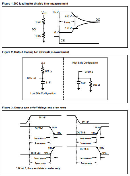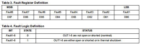 故障诊断功能包括一个8位内部移位寄存器。通过比较源极或漏极电压与VDD电压,提供开路或短路负载检测。当输出连接为低压侧装置或高压侧装置被指令关闭,可检测到开路负载。当作为低压侧装置或高压侧装置连接的输出装置被指令接通短路负载时,可以检测到。这个如果输出1-8出现短路、开路或温度过高情况,则每个通道的故障位“设置”。该故障寄存器的内容如表3所示。每个单独通道的输出负载状态在中定义表4。如果开路和短路满足最小持续时间标准,则随后重新锁闭如果热故障在CS变为“低”后符合持续时间标准,则热故障将被重新锁定条件仍然存在。故障寄存器能够检测和锁定多个故障条件(在8个输出中)在清除故障标志之间发生的。所有故障将在芯片选择(CS)的下降沿清除。