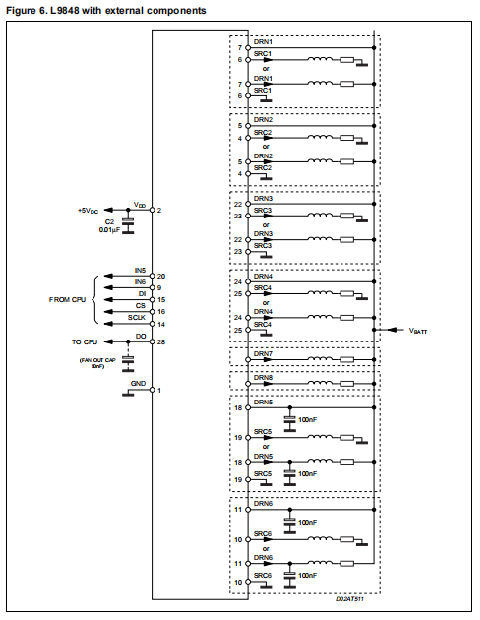 这会迫使输出的排水管或电源低于模块接地-20V。地面偏移量L9848接地和任何直接连接到高侧负载时底盘接地。如果驱动低侧负载,L9848接地和负载接地之间不会有偏移。此外,可能存在最大地差L9848接地和与之相连的任何其他模块之间的-0.5V至1.0V或±VAC(10-200赫兹)。