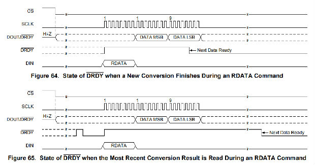 也可以在任何时候读取数据,而不必使用RDATA命令与DRDY信号同步。当发出RDATA命令时,当前存储在数据缓冲区中的转换结果可以在以下SCLK上升沿的DOUT/DRDY上移出。作为监视DRDY或DOUT/DRDY的替代方法,可以使用RDATA命令连续读取数据。在LSB被打卡后,必须对DRDY管脚进行轮询,以确定是否加载了新的转换结果。如果在读取操作期间完成了新的转换,但读取了以前转换的数据,则DRDY为低。否则,如果读取最近的结果,则DRDY为high。图64和图65说明了这两种情况下的行为。