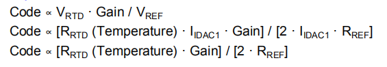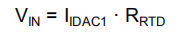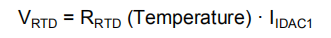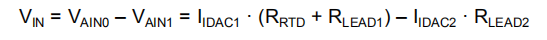 方程式18假设此时RTD(RLEADx)的单个引线电阻值为零。只有IDAC1激励RTD产生电压(VRTD),该电压与温度可靠的RTD值和IDAC1值成比例。