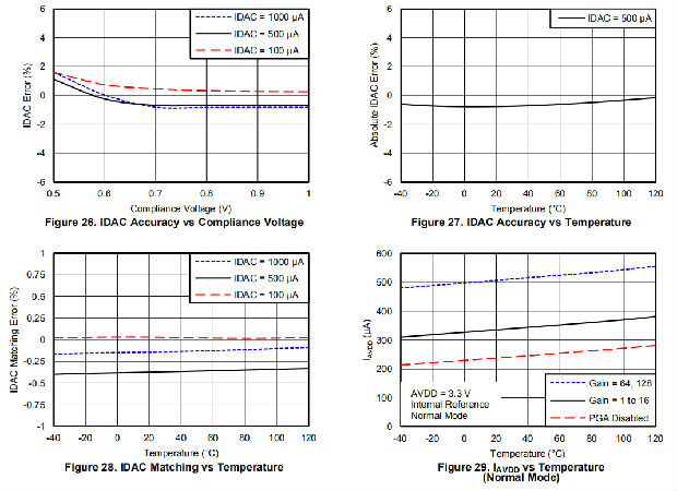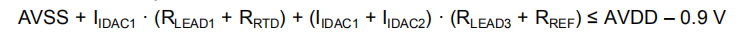 在设计电路时,还应注意满足IDACs的合规电压要求。IDAC要求最小净空(AVDD–0.9 V)才能准确操作。这一要求意味着必须始终满足等式24。