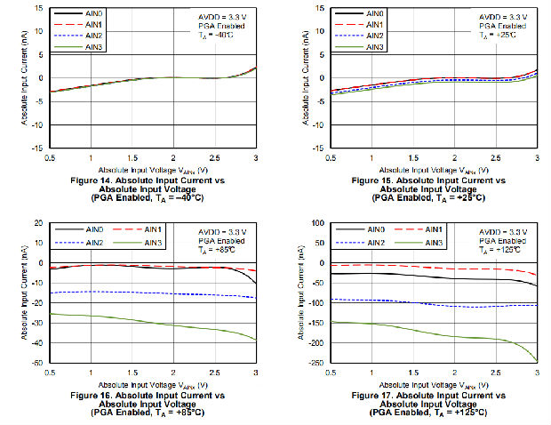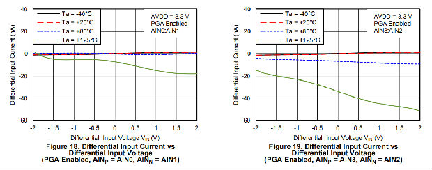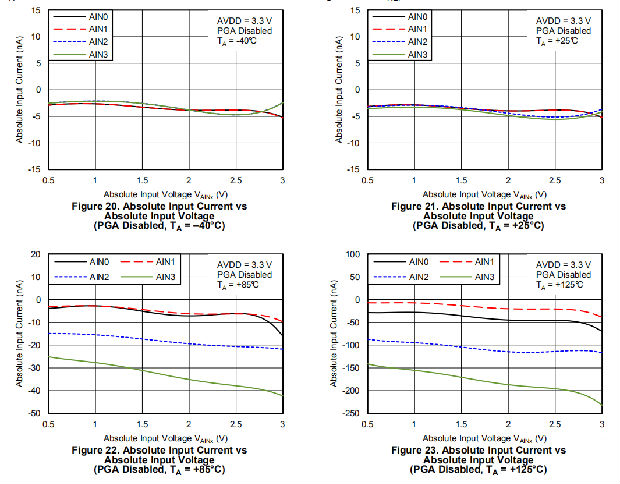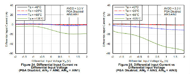 当通过在配置寄存器中设置PGA_旁路位来禁用PGA时,设备使用缓冲开关电容器级来获得增益1、2和4。开关电容器级前面的内部缓冲器确保电容器充放电对输入负载的影响最小。当PGA被禁用时,绝对输入电流(流入或流出每个输入的电流)和差动输入电流(正负输入之间的绝对电流差)的典型值,请参考图20至图25。
