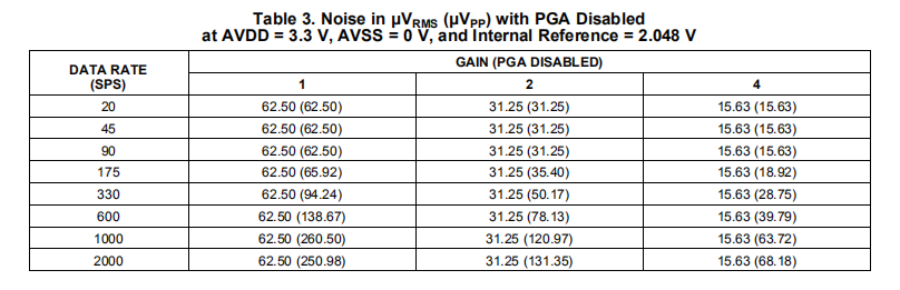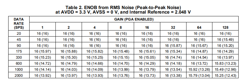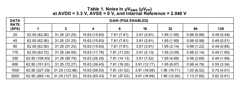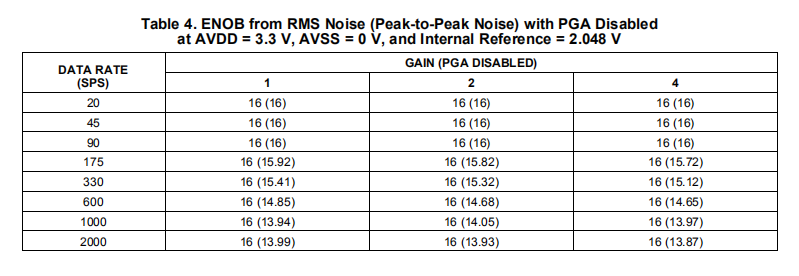 表1至表4总结了设备噪声性能。使用内部2.048-V基准,数据代表TA=+25°C时的典型噪声性能。显示的数据是单个设备在大约0.75秒的时间内平均读数的结果,并在输入端内部短路的情况下进行测量。表1和表3列出了所示条件下的输入参考噪声(单位:μVRMS)。请注意,括号中显示了μVPP值。表2和表4列出了使用等式1从μVRMS值计算的有效位数(ENOB)中的相应数据。注意,从峰值到峰值噪声值计算的无噪声位显示在括号中。