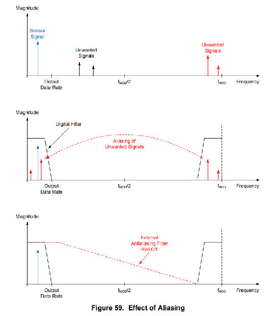 与任何采样系统一样,如果没有适当的抗锯齿过滤,则可能会发生混叠。当输入信号中高于ADC采样频率一半的频率分量(也称为Nyquist频率)被折叠并显示在采样频率的一半以下的实际频带中时,就会发生混叠。注意,在Δ∑ADC中,输入信号以调制器频率fMOD采样,而不是以输出数据速率采样。数字滤波器的滤波器响应以采样频率(fMOD)的倍数重复,如图59所示。信号或噪声达到滤波器响应重复的频率时被数字滤波器衰减。除非通过外部模拟滤波器衰减,否则在调制器频率或其倍数周围的输入信号中存在的任何频率分量都不会衰减,从而混叠回感兴趣的频带。有些信号固有的带宽限制;例如,热电偶的输出变化率有限。然而,这些信号在更高的频率上可能包含噪声和干扰成分,这些成分可以折回到感兴趣的频带中。一个简单的RC滤波器(在大多数情况下)足以抑制这些高频分量。在设计输入滤波电路时,一定要考虑滤波器网络和ADS1120的输入阻抗之间的相互作用。