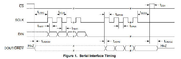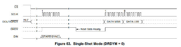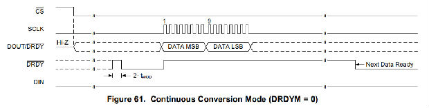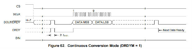 此外,DOUT/DRDY引脚也可以通过在配置寄存器中设置DRDYM高电平来配置为数据就绪指示器。DOUT/DRDY在DRDY引脚变低的同时转换为低电平,以指示新的转换数据可用。这两个信号都可以用来检测新数据是否准备就绪。但是,由于当CS较高时DOUT/DRDY被禁用,因此当SPI总线上存在多个设备时,监视转换结束的推荐方法是使用专用DRDY管脚。