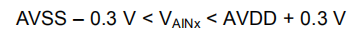 至AVDD和AVSS的静电放电(ESD)二极管保护输入。为防止ESD二极管开启,任何输入端的绝对电压必须保持在等式4的范围内:
