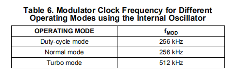 ADS1120使用Δ∑调制器将模拟输入电压转换为脉冲编码调制(PCM)数据流。调制器在正常和占空比模式下以fMOD=fCLK/16的调制器时钟频率运行,在turbo模式下fMOD=fCLK/8,其中fCLK由内部振荡器或外部时钟源提供。表6显示了使用内部振荡器或4.096 MHz外部时钟的每个模式的调制器频率。