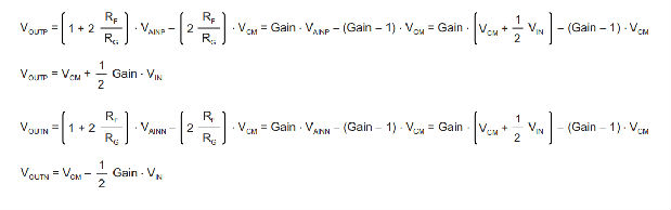 对于放大器A1和A2的输出电压的要求(方程式7)也可以使用方程式11和方程式12转换为输入共模电压范围的要求,方程式13和方程式14给出了这些要求: