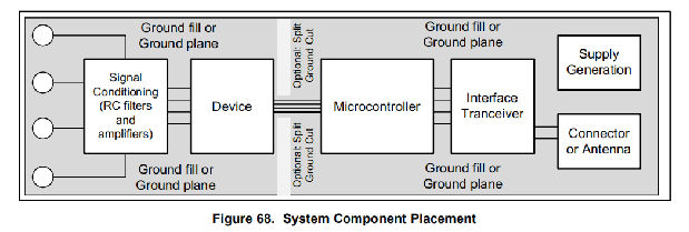 TI建议在为模拟和数字元件设计印刷电路板(PCB)时采用最佳设计实践。此建议通常意味着布局应将模拟组件[如ADC、放大器、基准、数模转换器(DAC)和模拟MUX]与数字组件[例如微控制器、复杂可编程逻辑器件(CPLD)、现场可编程门阵列(FPGA)、射频(RF)收发器]分开,通用串行总线(USB)收发器和开关调节器]。图68显示了一个良好的组件放置示例。虽然图68提供了一个很好的组件放置示例,但是每个应用程序的最佳布局都是由所采用的几何结构、组件和PCB制造能力所决定的。也就是说,没有一个布局对每个设计都是完美的,在使用任何模拟组件进行设计时,必须始终仔细考虑。
