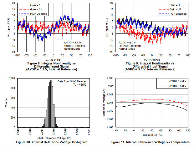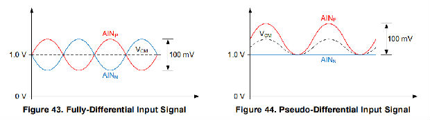 在全差分传感器信号的情况下,每个输入(AINP,AINN)可在共模电压(VAINP+VAINN)/2附近摆动至±50 mV,该电压必须保持在1.0 V和2.3 V之间。对称惠斯通电桥的输出是全差分信号的一个例子。