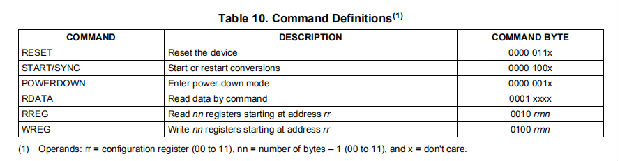 设备提供六种不同的命令来控制设备的操作,如表10所示。四个命令是独立的指令(复位、启动/同步、断电和RDATA)。从设备读取(RREG)和写入(WREG)配置寄存器数据的命令需要附加信息作为指令的一部分。