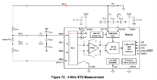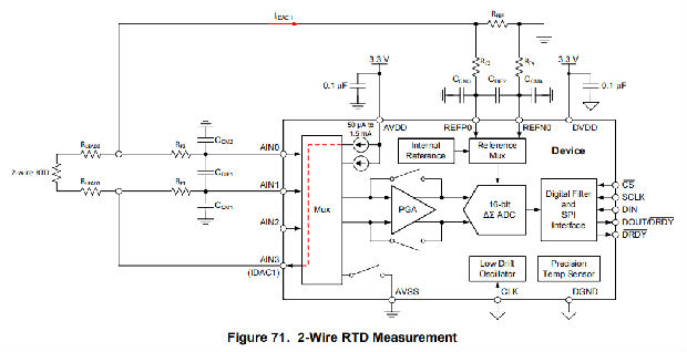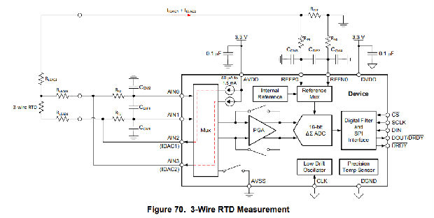 该设备还提供了将idac路由到用于测量的相同输入的可能性。如果滤波电阻值RF1和RF2足够小并且匹配良好,那么IDAC1可以路由到AIN1,IDAC2可以路由到AIN0,如图70所示。这样,即使两个共享同一参考电阻的3线电阻式温度检测器也可以用一个装置进行测量。
