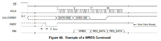 WREG命令可以在不破坏正在进行的读取操作的情况下发送。图66显示了在连续转换模式下读取转换数据时发送WREG命令以写入两个配置寄存器的示例。在命令被时钟记录后(在第32个SCLK下降沿之后),设备重置数字滤波器并开始使用新的寄存器设置进行转换。WREG命令可以在任何8位边界上发送。