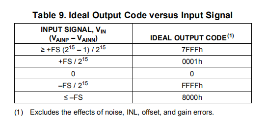 该设备以二进制2补码格式提供16位数据。正的满标度输入产生7FFFh的输出代码,负的满标度输入产生8000h的输出代码。对于超过满标度(FS)的信号,输出会在这些代码处截断。表9总结了不同输入信号的理想输出代码。