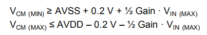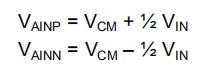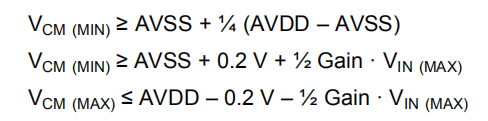 为了计算最小和最大共模电压限值,必须使用应用中出现的最大差分输入电压(VIN(MAX)),这不一定是可能的FS范围。