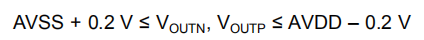 图39中两个放大器(A1和A2)的输出不能摆动到距离电源(AVSS和AVDD)200 mV以上的位置。如果输出端输出端和输出端驱动端离模拟电源轨的距离小于200毫伏,放大器就会饱和,从而变得非线性。此条件意味着输出电压必须满足方程式7: