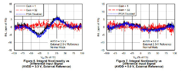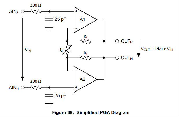 VIN表示差分输入电压VIN=(VAINP–VAINN)。PGA的增益可通过方程式5计算: