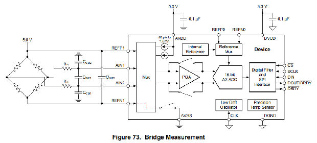 该设备提供了几个特性,以便于比率电桥测量的实现(例如增益高达128 V/V的PGA、缓冲、差分参考输入和低压侧电源开关)。