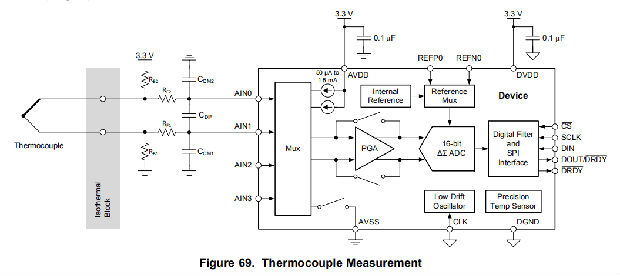 图69显示了使用内部高精度温度传感器进行冷端补偿时热电偶测量系统的基本连接。除了热电偶本身,唯一需要的外部电路是两个偏置电阻、一个简单的低通抗混叠滤波器和电源去耦电容器。