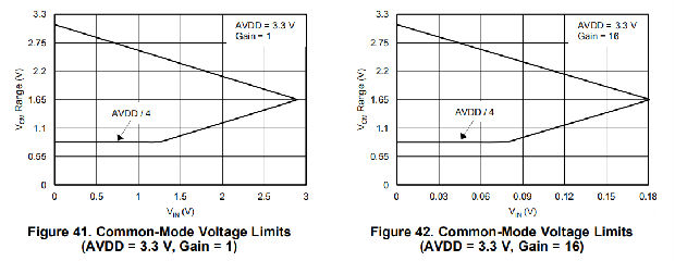 图41和图42显示了AVDD=3.3 V和AVSS=0 V(增益=1和增益=16)的共模电压限值的图形表示。