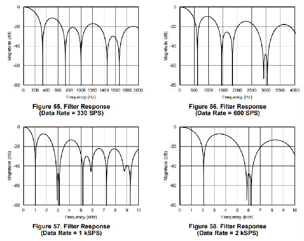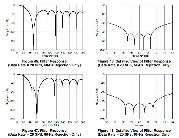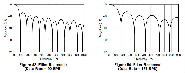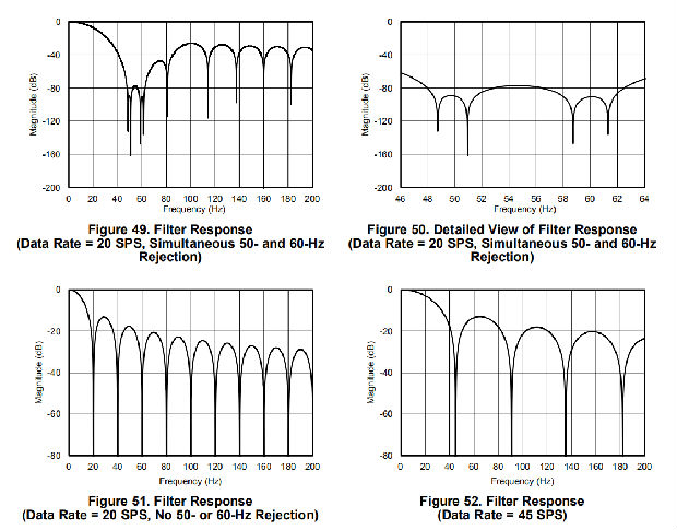 如果使用频率不是4.096mhz的外部时钟,滤波器陷波器的变化与时钟频率成比例。例如,如果使用2.048-MHz时钟,则使用4.096-MHz时钟时以20 Hz出现的陷波出现在10 Hz处。