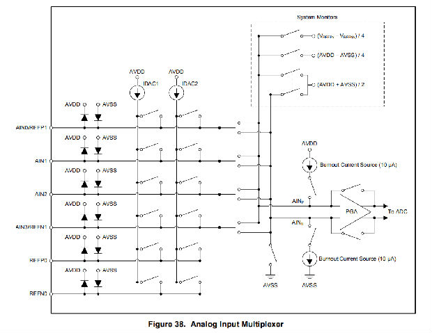 该设备包含一个非常灵活的输入多路复用器,如图38所示。可以测量四个单端信号、两个差分信号或两个单端信号和一个差分信号的组合。多路复用器由配置寄存器中的四位(MUX[3:0])配置。当测量单端信号时,负ADC输入(AINN)通过多路复用器内部的开关连接到AVS。出于系统监控目的,可选择模拟电源(AVDD–AVSS)/4或当前选择的外部参考电压(VREFPx–VREFNx)/4作为ADC的输入。多路复用器还可以将两个可编程电流源中的任何一个路由到任何模拟输入(AINx)或任何专用参考引脚(REFP0、REFN0)。