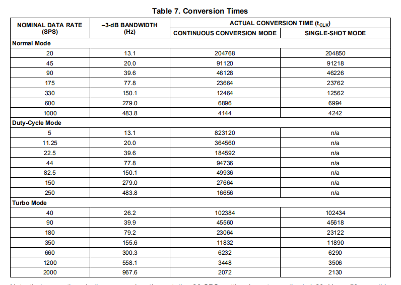 表7显示了每个数据速率设置的实际转换时间。所提供的值是以使用时钟频率fCLK=4.096兆赫的外部时钟的tCLK周期表示的。如果使用频率不是4.096mhz的外部时钟,则数据速率按比例缩放。