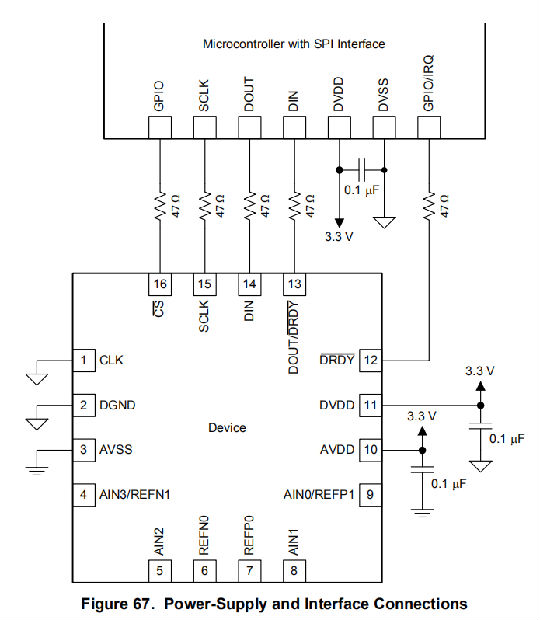 TI建议将47Ω电阻器与所有数字输入和输出引脚(CS、SCLK、DIN、DOUT/DRDY和DRDY)串联。这种电阻平滑了急剧的转变,抑制了过冲,并提供了一些过电压保护。必须注意仍然满足所有SPI定时要求,因为附加电阻与数字信号线上的总线电容相互作用。