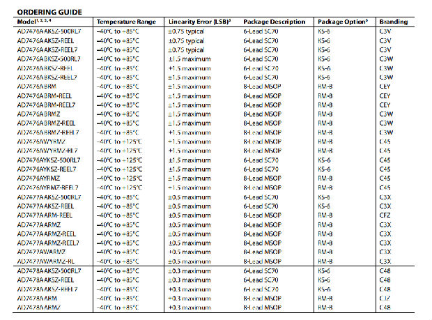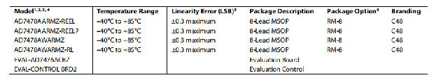 AD7476AWYRMZ、AD7476AWYRMZ-RL7、AD7477AWARMZ、AD7477AWARMZ-RL、AD7478AWARMZ和AD7478AWARMZ-RL型号可提供受控制造,以支持汽车应用的质量和可靠性要求。请注意,这些汽车型号的规格可能与商用车型不同;因此,设计师应仔细阅读本数据表的规格部分。只有所示的汽车级产品可用于汽车应用。请联系您当地的模拟设备客户代表以获取具体的产品订购信息,并获取这些型号的特定汽车可靠性报告。