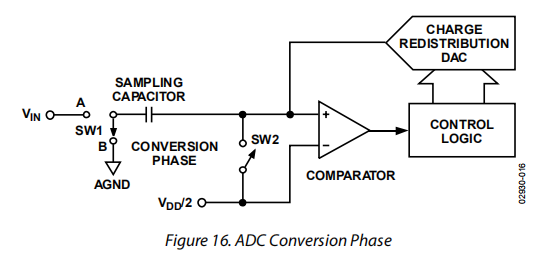 当ADC开始转换时(见图16),SW2打开,SW1移动到位置B,导致比较器变得不平衡。控制逻辑和电荷再分配DAC用于从采样电容器中增减固定量的电荷,以使比较器回到平衡状态。当比较器重新平衡时,转换完成。控制逻辑产生ADC输出代码。图17显示了ADC传输函数。