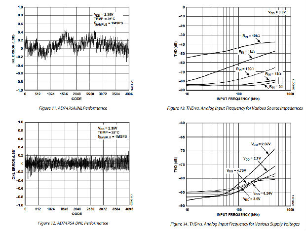 图11和图12显示了AD7476A的INL和DNL性能。图13显示了在使用3.6 V电源电压并以1 MSPS的速率采样时,不同源阻抗的总谐波失真与模拟输入频率的关系图(参见模拟输入部分)。图14所示为各种电源电压下的总谐波失真与模拟输入信号频率的关系图,而采样频率为20mhz,频率为1msps。