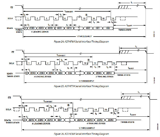 图24、图25和图26分别显示了与AD7476A、AD7477A和AD7478A串行接口的详细时序图。串行时钟提供转换时钟,并在转换期间控制来自AD7476A/AD7477A/AD7478A的信息传输。