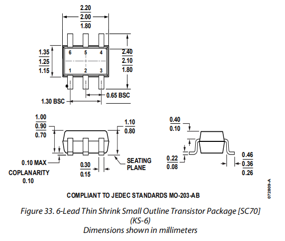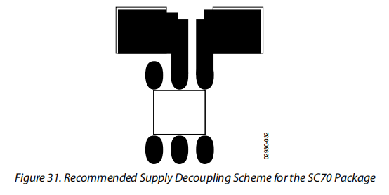 良好的解耦也非常重要。例如,使用680 nF 0805电容器将电源与GND断开。当在涉及元件尺寸的应用中使用SC70封装时,例如,可以使用220 nF 0603电容器。然而,在这种情况下,去耦可能不那么有效,导致大约0.3db的SINAD退化。为了从这些去耦元件中获得最佳性能,用户应努力将去耦电容器与VDD和GND引脚之间的距离保持在最小值,并将各自的引脚连接起来。图31和图32分别显示了SC70和MSOP封装的去耦电容器的建议位置。