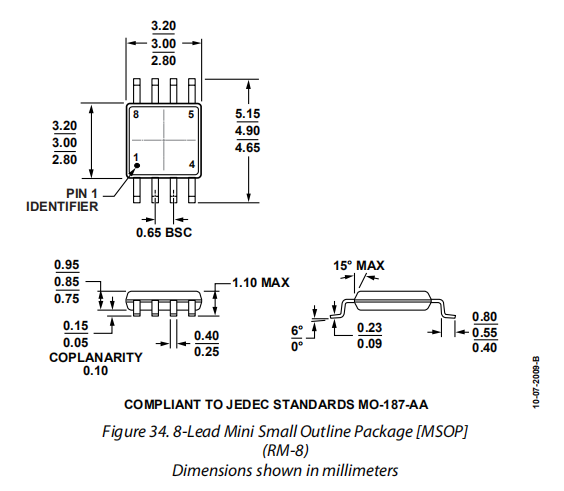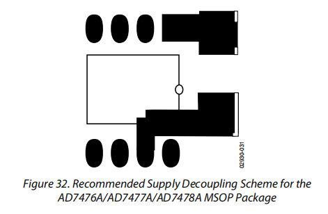 如图32所示,对于MSOP封装,去耦电容器被放置在尽可能靠近IC的地方,与VDD和GND引脚的轨道长度很短。去耦电容器也可以放置在集成电路板正下方的印刷电路板下侧,在通孔连接的VDD和GND引脚之间。对于厚度超过标准1.6毫米的多氯联苯,不建议采用这种方法。最佳的性能是实现与去耦电容器在顶部的电路板旁边的IC。