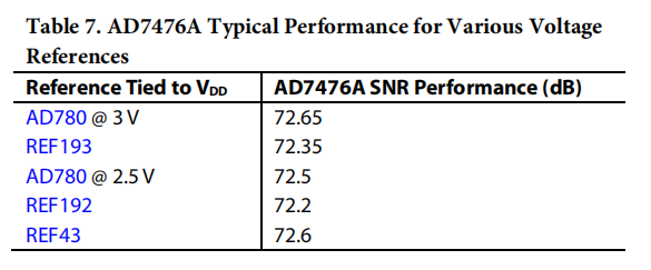 REF19x向AD7476A/AD7477A/AD7478A输出稳定电压。如果使用低压差REF193,则需要向AD7476A/AD7477A/AD7478A供电的电流通常为1.2 mA。当ADC以1 MSPS的速率转换时,REF193需要向AD7476A/AD7477A/AD7478A。REF193的负载调节通常为10 ppm/mA(VS=5 V),由此产生的1.7 mA的误差为17 ppm(51μV)。这对应于REF193中VDD=3V的AD7476A的0.069 LSB错误,AD7477A的0.017 LSB错误,AD7478A的0.0043 LSB错误。