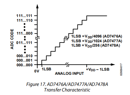 AD7476A/AD7477A/AD7478A的输出编码是直接二进制的。设计的代码转换发生在连续的整数LSB值处,即1 LSB、2 LSB,依此类推。AD7476A的LSB大小为VDD/4096,AD7477A为VDD/1024,AD7478A为VDD/256。AD7476A/AD7477A/AD7478A的理想传输特性如图17所示。
