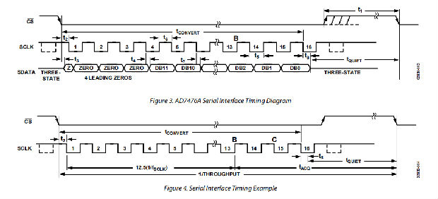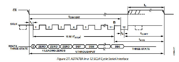 对于AD7478A,如果在提供了4个前导零和8个转换位后,在第12个上升沿使CS处于高位,则该部件可以达到1.2msps的吞吐量。对于AD7478A,跟踪和保持回到第11上升沿的轨道。在这种情况下,fSCLK=20 MHz和1.2 MSPS的吞吐量提供了: