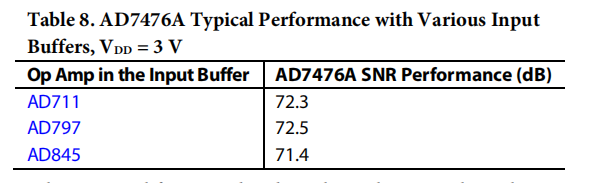 表8提供了在相同设置条件下,在室温下使用各种运算放大器作为输入缓冲器的典型性能数据。