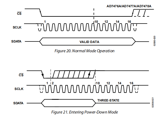 AD7476A/AD7477A/AD7478A的工作模式是通过在转换期间控制CS信号的(逻辑)状态来选择的。有两种可能的操作模式:正常和断电。转换启动后CS拉高的点决定了AD7476A/AD7477A/AD7478A是否进入断电模式。类似地,如果已经断电,CS可以控制设备是恢复正常运行还是保持断电。这些操作模式旨在提供灵活的电源管理选项。可以选择这些选项来优化功耗/吞吐量比率,以满足不同的应用需求。