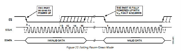 如图22所示,当以虚拟循环从断电模式通电时,在部件断电时处于保持模式的跟踪和保持在CS下降沿后接收到的第一个SCLK边缘之后返回到跟踪模式。如图22中的A点所示。尽管在任何SCLK频率下,一个虚拟周期足以为设备通电并获取VIN,但并不一定意味着必须始终经过16个SCLK的完整虚拟周期才能通电并完全获取VIN;1μs足以通电设备并获取输入信号。例如,如果将5 MHz SCLK频率应用于ADC,则周期时间变为3.2μs。在一个虚拟周期(3.2μs)中,部件通电并且VIN完全获取。然而,在使用5 MHz SCLK的1μs之后,只会经过5个SCLK周期。在这个阶段,ADC将完全通电并获取信号。在这种情况下,在第10次SCLK下降沿后,CS可以被调高,并在一段时间后再次降低,tQUIET,以启动转换。