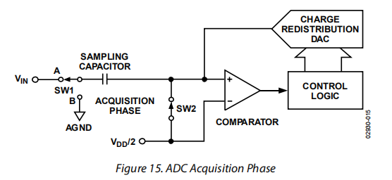 AD7476A/AD7477A/AD7478A是基于电荷再分配DAC的逐次逼近型模数转换器。图15和图16显示了ADC的简化示意图。图15显示了采集阶段的ADC。SW2闭合,SW1处于位置A,比较器保持在平衡状态,采样电容器采集VIN上的信号。