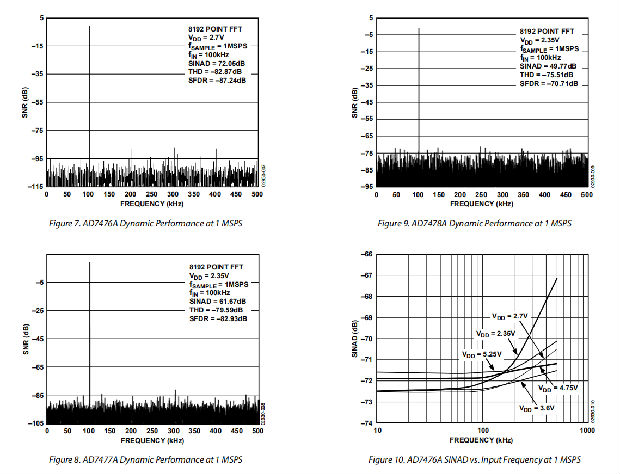 图7、图8和图9分别显示了AD7476A、AD7477A和AD7478A在1 MSPS采样率和100 kHz输入频率下的典型FFT图。图10显示了AD7476A在1毫秒/秒、SCLK频率为20兆赫时,各种电源电压的信噪比性能与输入频率的关系。