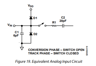 图19显示了AD7476A/AD7477A/AD7478A模拟输入结构的等效电路。两个二极管D1和D2为模拟输入提供ESD保护。必须注意确保模拟输入信号不会超过电源轨300毫伏。这会导致二极管正向偏压,并开始向基板传导电流。这些二极管在不会对零件造成不可逆损坏的情况下可以传导的最大电流为10毫安。图19中的电容器C1通常约为6 pF,主要归因于管脚电容。电阻器R1是由开关的导通电阻组成的集中元件。该电阻通常约为100Ω。电容器C2是ADC采样电容器,通常具有20pf的电容。
