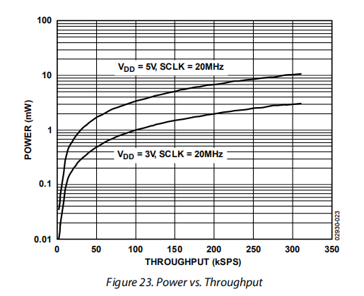 图23显示了在使用5V和3V电源的转换之间使用断电模式时的功率与吞吐量。断电模式用于大约333 kSPS或更低的吞吐量,因为在较高的采样率下,断电模式不会产生任何节能效果。