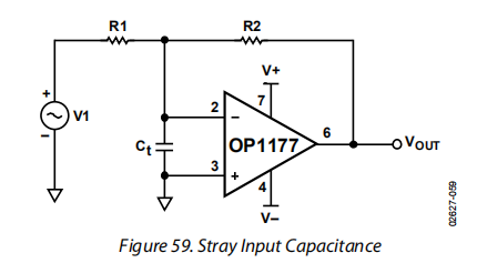 运算放大器电路(Ct)中的有效输入电容由三个元件组成。这些是输入端子之间的内部差分电容,每个输入对地的内部共模电容,以及包括寄生电容在内的外部电容。在图59中的电路中,闭环增益随着信号频率的增加而增加。