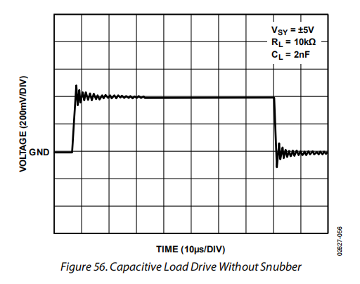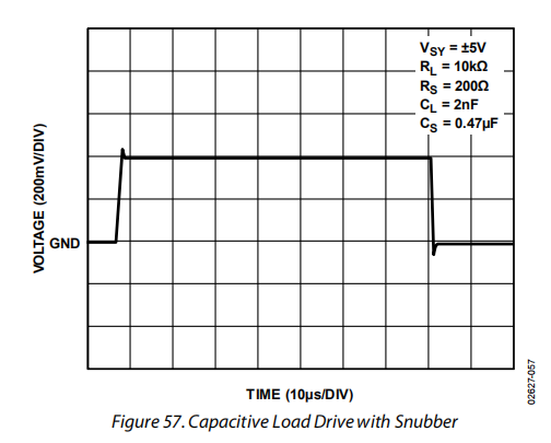 如图58所示,将R-C网络与负载电容(CL)并联,可使放大器在不引起振荡或过冲的情况下驱动更高的CL值。