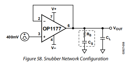 在这种情况下,缓冲网络被用来防止振荡和减少超调量。这种方法的一个显著优点是它没有减小输出摆幅,因为电阻RS不在反馈回路内。
