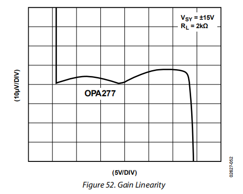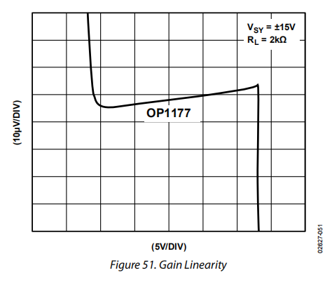 OP1177即使在重载情况下也具有良好的增益线性,如图51所示。将其性能与OPA277进行比较,如图52所示。两个装置在相同条件下测量,RL=2kΩ。OP2177(双)在较低电压下几乎没有失真。与OPA277相比,OP1177在不同电源电压和不同负载下的性能远远超过了OPA277。