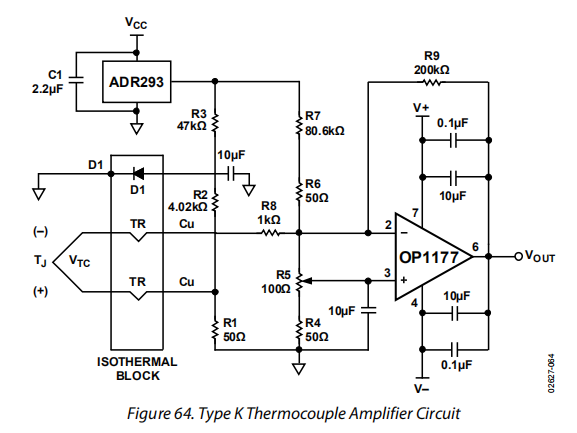 OPx177是热电偶电路的理想放大器,因为它具有非常低的失调电压、优良的PSRR和CMRR,以及低频低噪声。