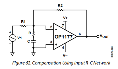这通常是通过在放大器的输入端之间插入一个电容器来实现的,如图61所示。然而,这种方法也可能导致不稳定,这取决于电容值。